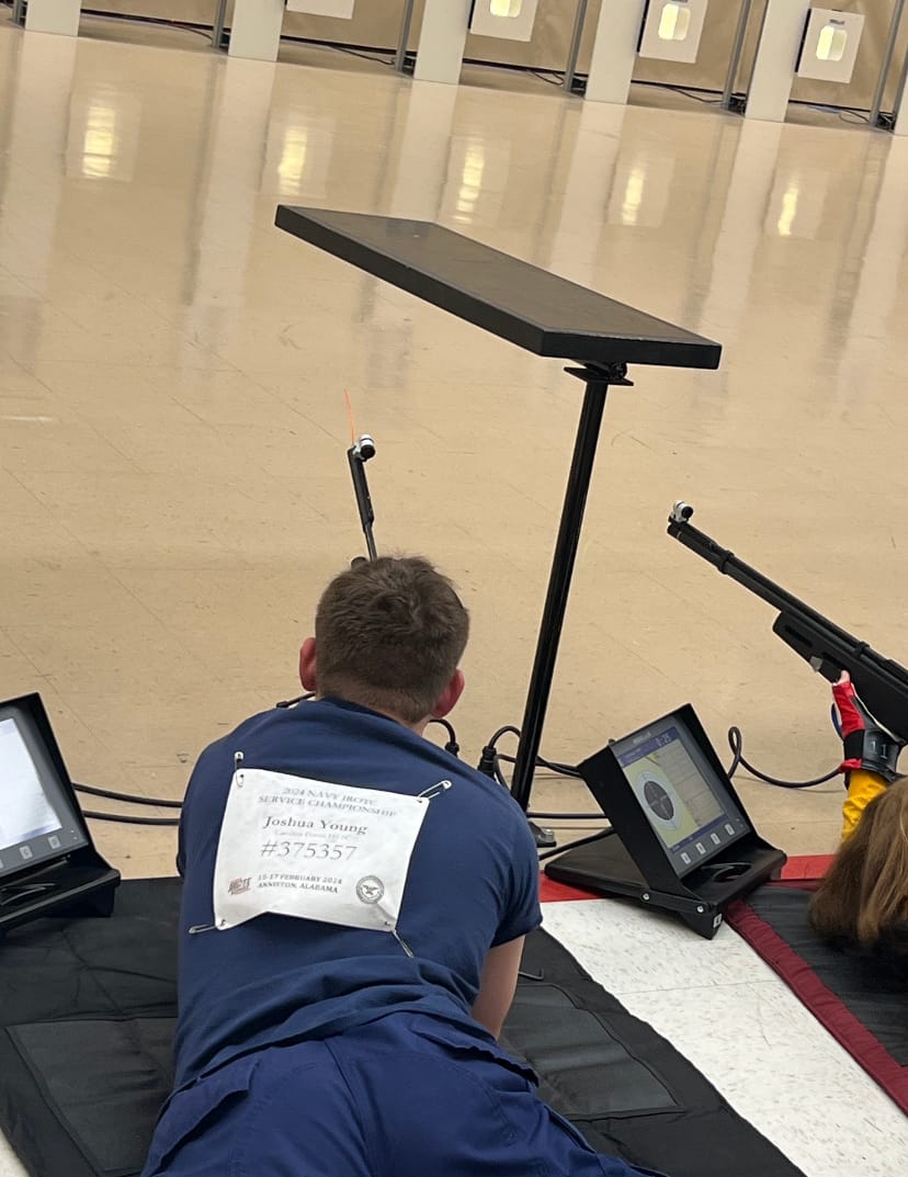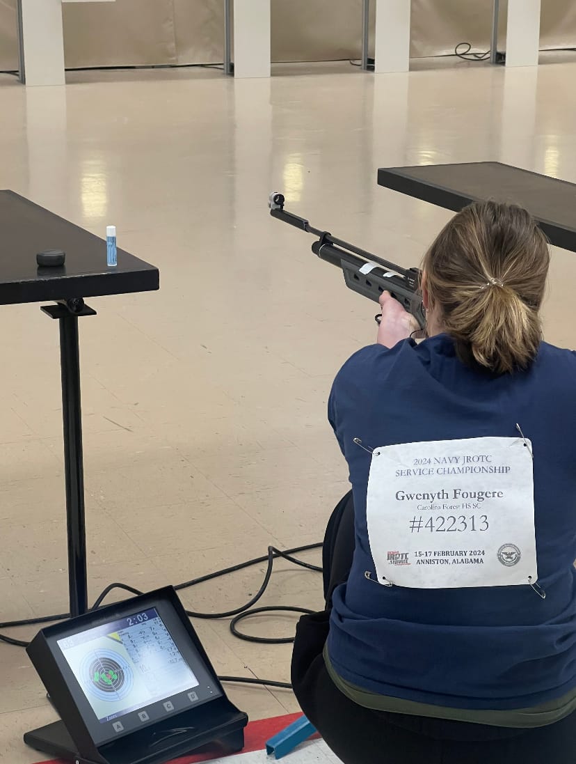 A remarkable feat was accomplished by Carolina Forest High School's Rifle Team at the 2024 Navy National Service Championships in Anniston, Alabama on February 14th, 2024. Rifle Team Members Joshua Young and Gwenyth Fougere shot as Individual for the Rifle Competition. Joshua Young was selected as a Competitor by the Area 7 Manager based on a combined score from the Area 7 Rifle competition competing against over 20 High Schools. Gwenyth Fougere was selected for the Rifle Competition for the Nation by JROTC Postal based on her qualified scores in the National Competition.