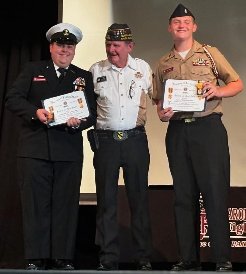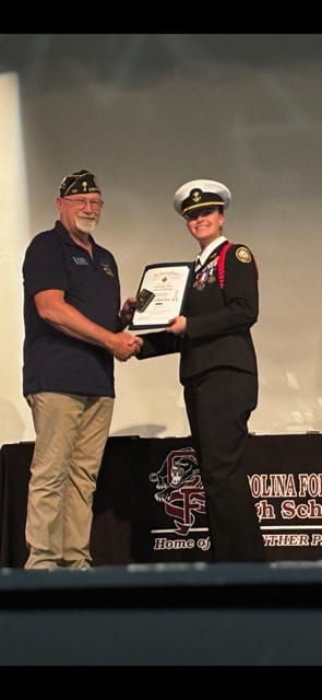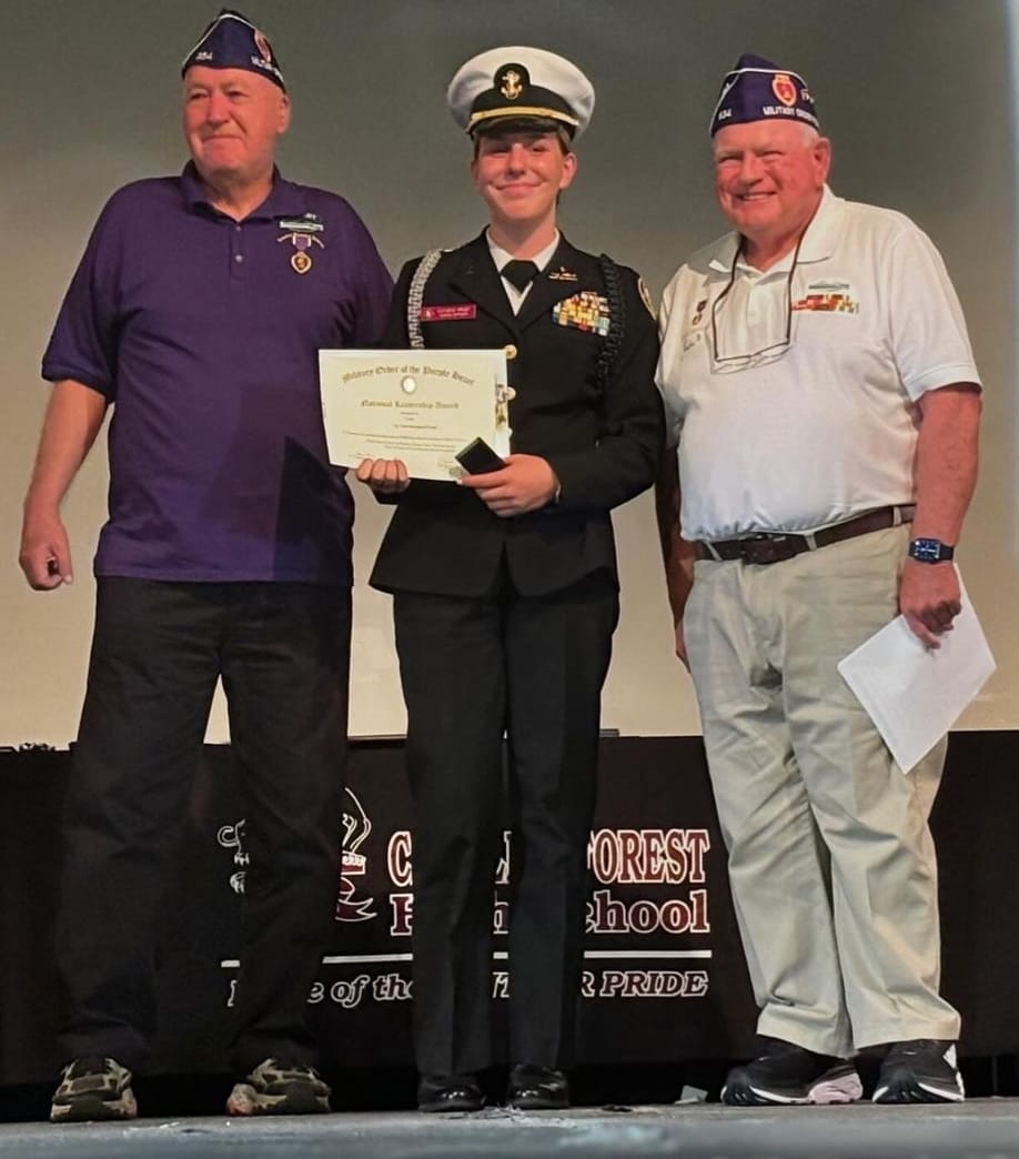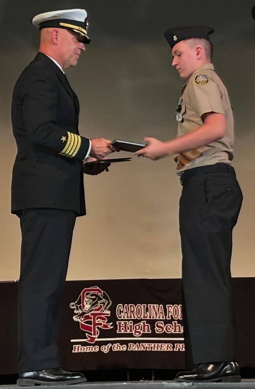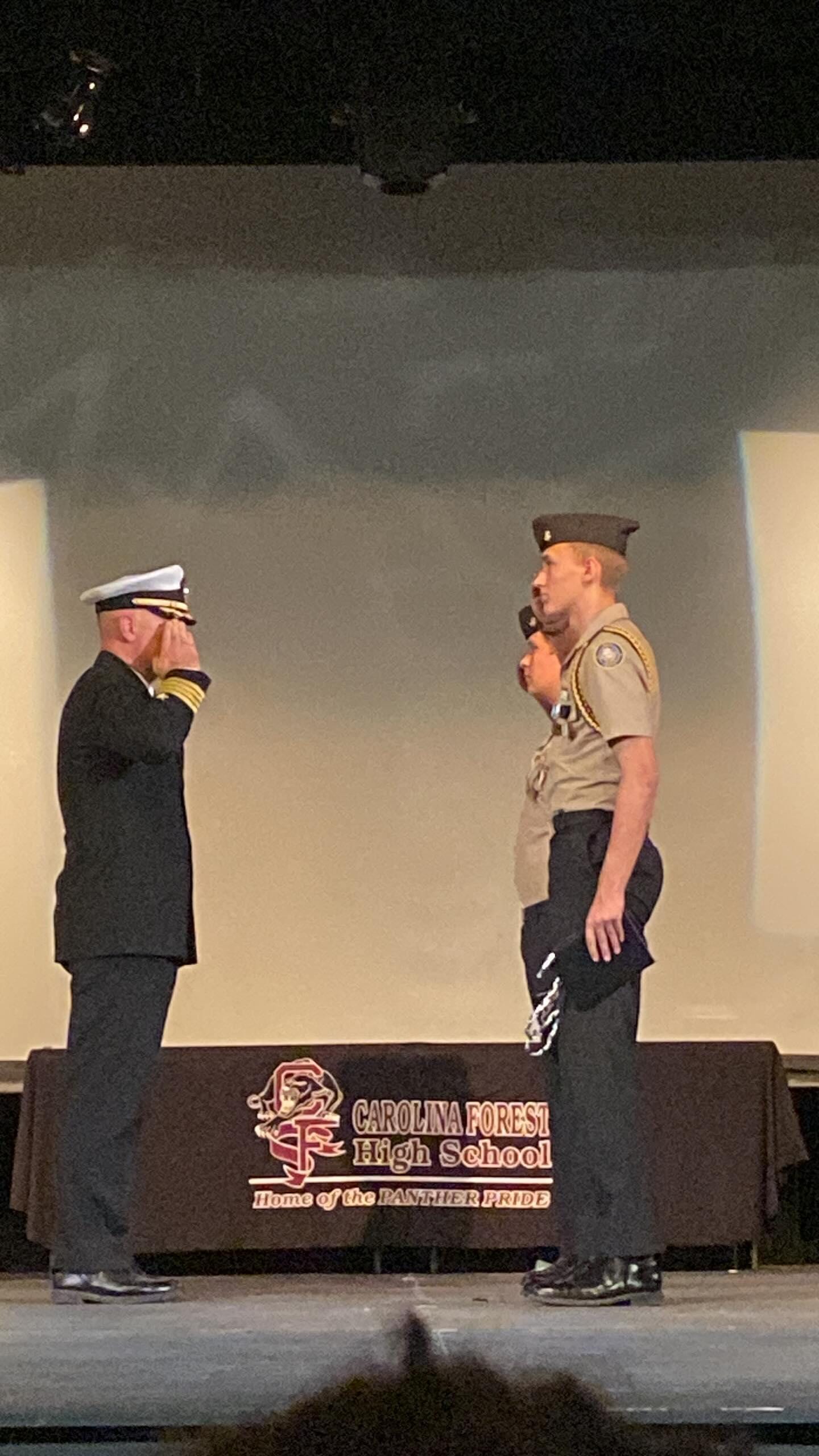 On May 15th, Carolina Forest High School NJROTC held an end-of-year awards ceremony to conclude another exceptional year for our unit. During the ceremony, multiple distinguished cadets were recognized and awarded for their exemplary conduct, leadership potential, aptitude, military bearing, and personal appearance. These awards were given to the cadets by groups that support and sponsor our NJROTC program such as the Veterans of Foreign Wars, Army National Guard, and Military Order of the Purple Heart.