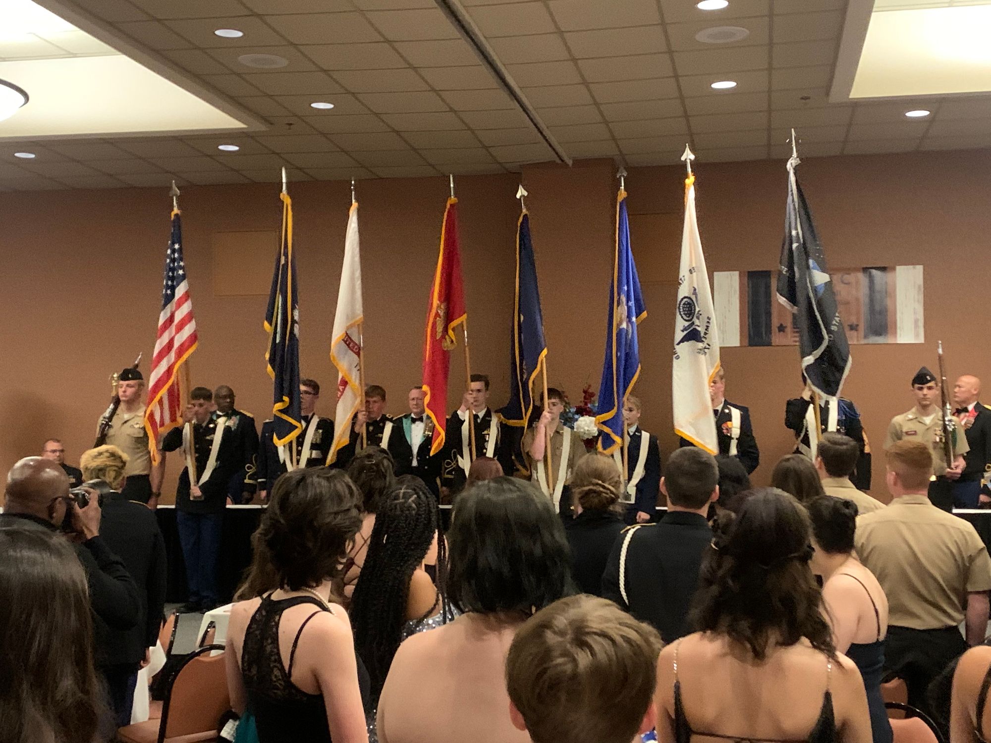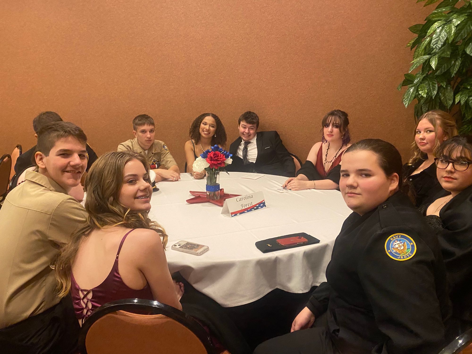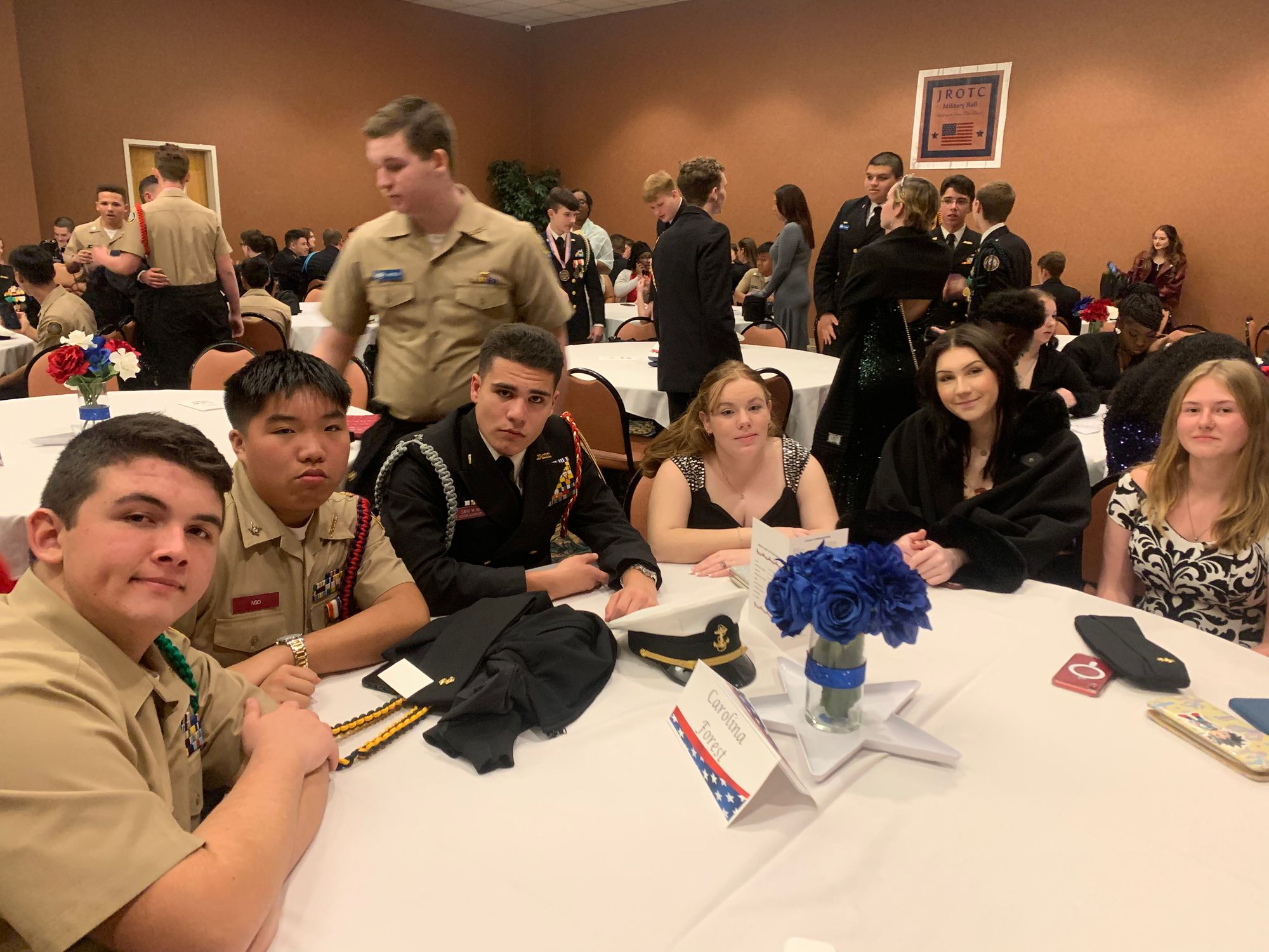 For the first time in three years, Carolina Forest and many other participating schools all came together to take part in the first annual JROTC Military Ball since the start of COVID-19. The military ball consisted of a formal portion, where cadets sat at their respective school's tables, stood for the presentation of colors presented by a ten-man color guard, and then waited for this year's cadet of the year to be announced.