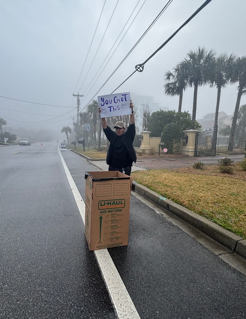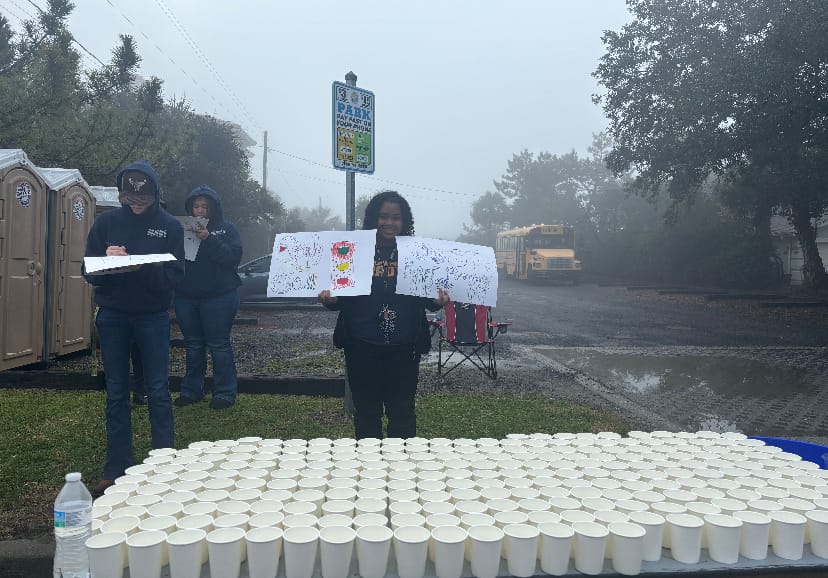 On March 2nd, the NJROTC cadets traveled early in the rainy morning to Ocean Boulevard to volunteer in the Myrtle Beach Marathon. The cadets were placed at the 16-mile mark and were responsible for creating and holding up signs, handing out water as well as Gatorade to runners, and cheering runners on as they went by. Overall, our cadets carried themselves very well at this event.