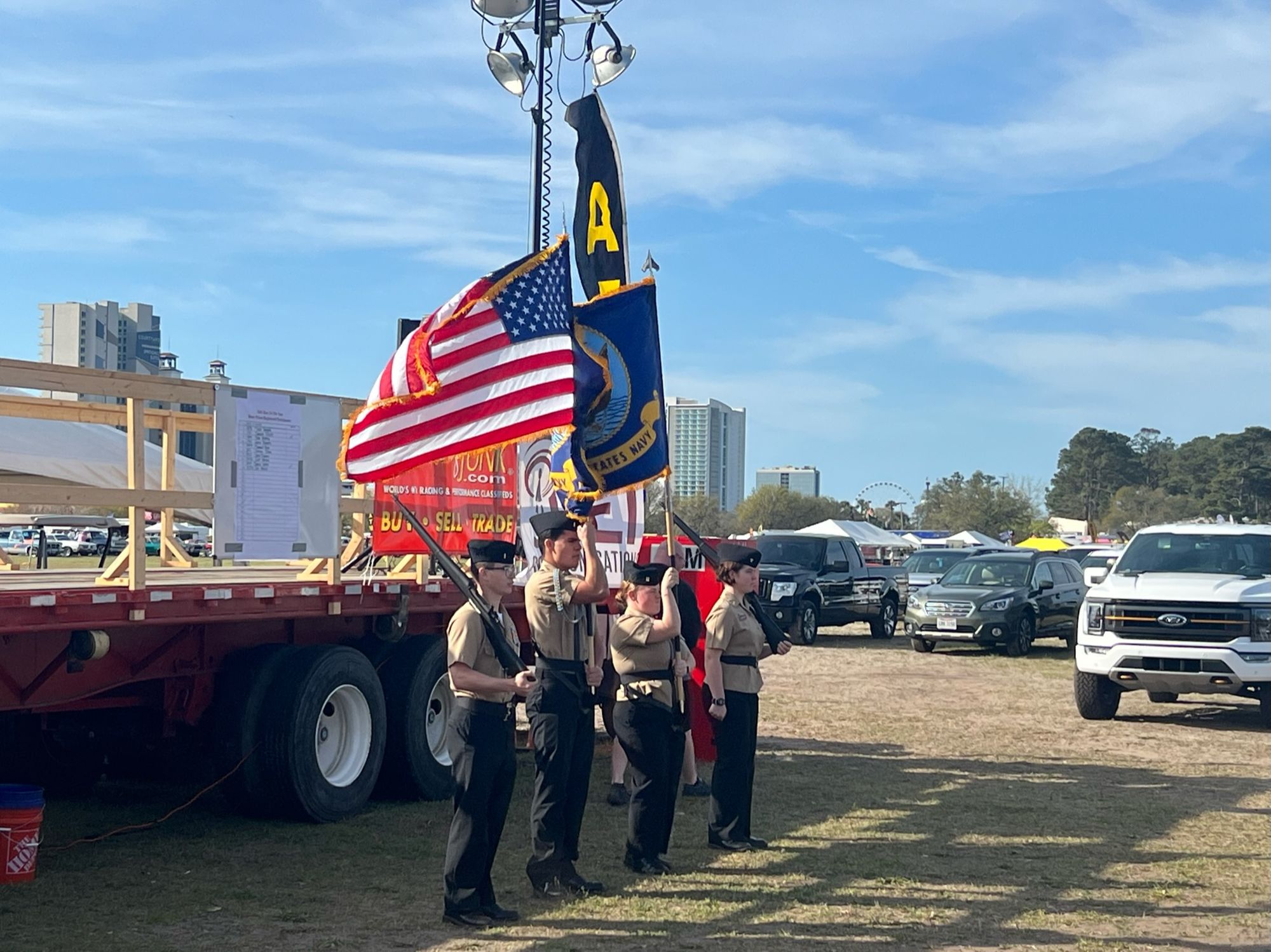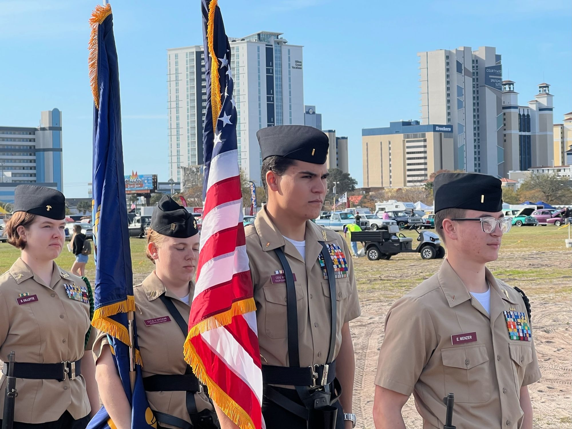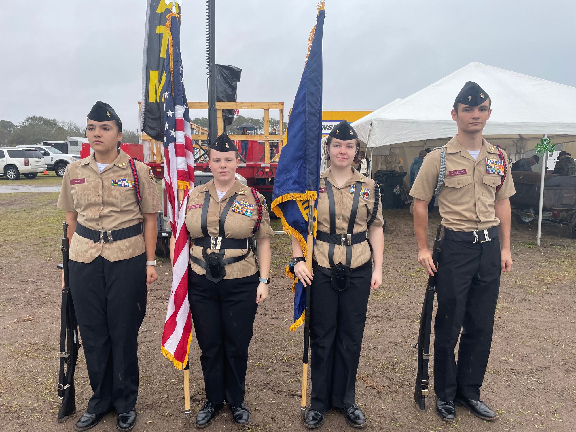 In addition to the field clean-up, our Color Guard Officer, C/ENS Mick Miller, put together a Colorguard to perform at the Car Show in order to respect our country and the hardworking men and women of the nation. Alongside the colors, Cadet Morgan Williams diligently volunteered to sing the National Anthem to complete the ceremony!
